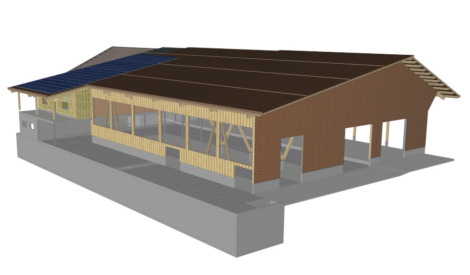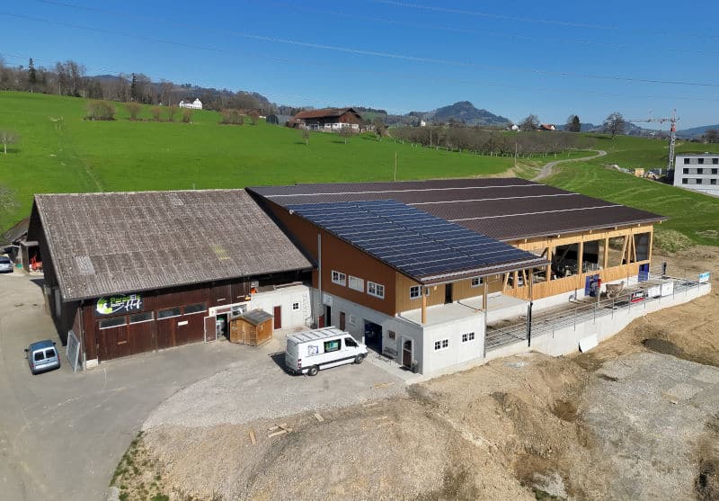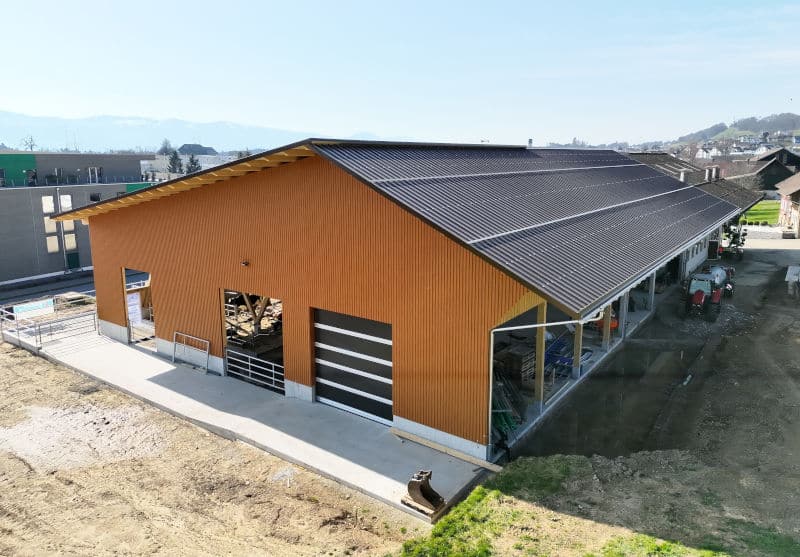 Projekt: Der Boxenlaufstall für 50 Milchkühe wird von uns und mit Schweizer Holz gebaut. Der Laufhof mit perforierten Betonspaltenböden befindet sich auf dem Jauchetrog mit total 530m3 Volumen. Die Laufgänge werden durch einen automatischen Entmistungsroboter gereinigt.