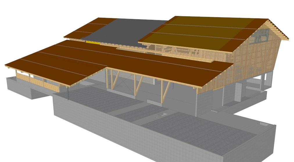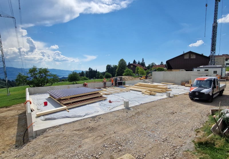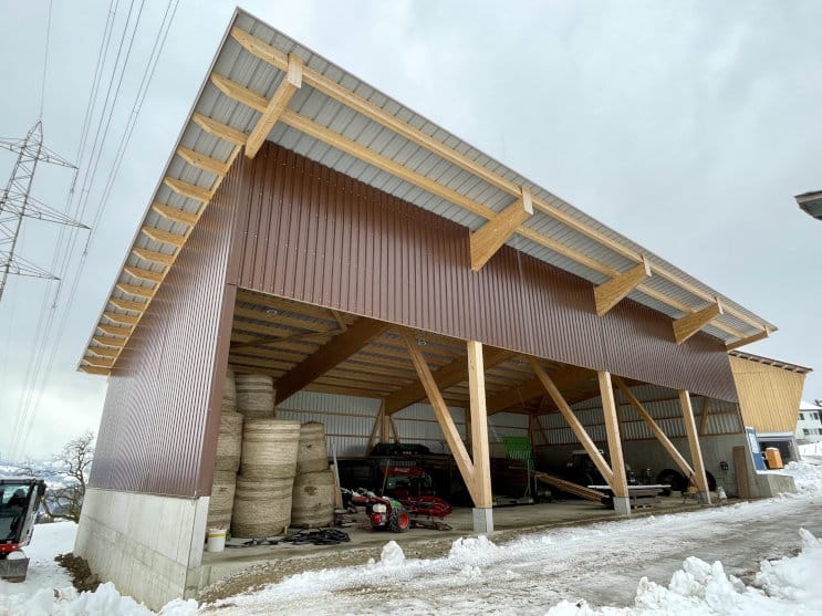 Von der Projektierung bis zur Ausführung wurde der Milchviehlaufstall für 37 Kühe und dazugehörendem Jungvieh von uns geplant und mit Schweizer Holz gebaut. Der Melkstand ist mit einem Tandem-Melkstand ausgerüstet. Der Laufhof mit perforierten Betonspaltenböden befindet sich auf dem Jauchetrog mit total 970m3 Volumen.
