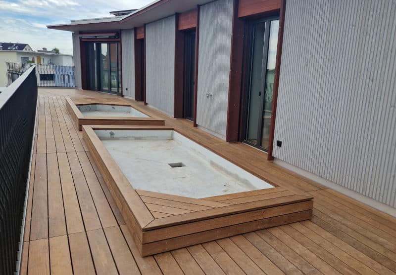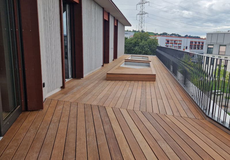 Holzelementbau (Statischer Hybridbau), Innere Verkleidungen, Holzfassade, Vordächer, Terrassenrost