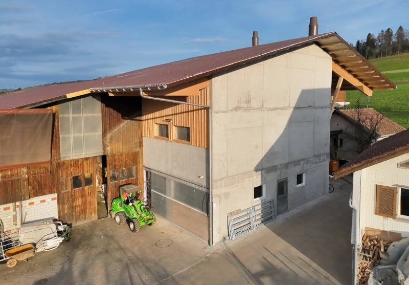 Projekt: Von der Projektierung bis zur Ausführung wurde der Ersatzbau vom Futterlager von uns geplant und mit Schweizer Holz gebaut. Der in die Jahre gekommene Stall wurde abgebrochen und durch einen Neubau ersetzt. Im Erdgeschoss finden die Aufzuchtkälber ihren sonnigen Platz und im Obergeschoss mit Hocheinfahrt, kann das Futter abgeladen und gelagert werden.