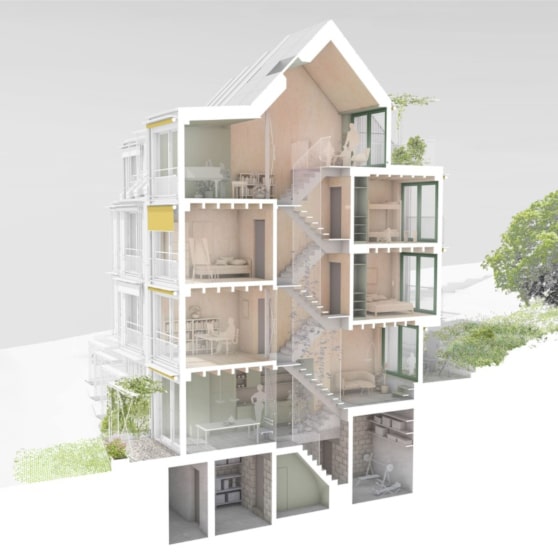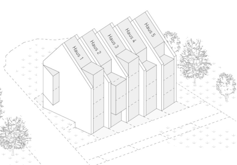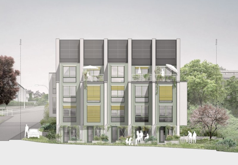Projekt: An der Waserstrasse in Zürich entstehen 5 Reiheneinfamilienhäuser, welche komplett in Holzelementbauweise erstellt werden. Durch die Lage am Hang und die versetzte Anordnung, haben sämtliche Wohneinheiten die bestmögliche Aussicht.