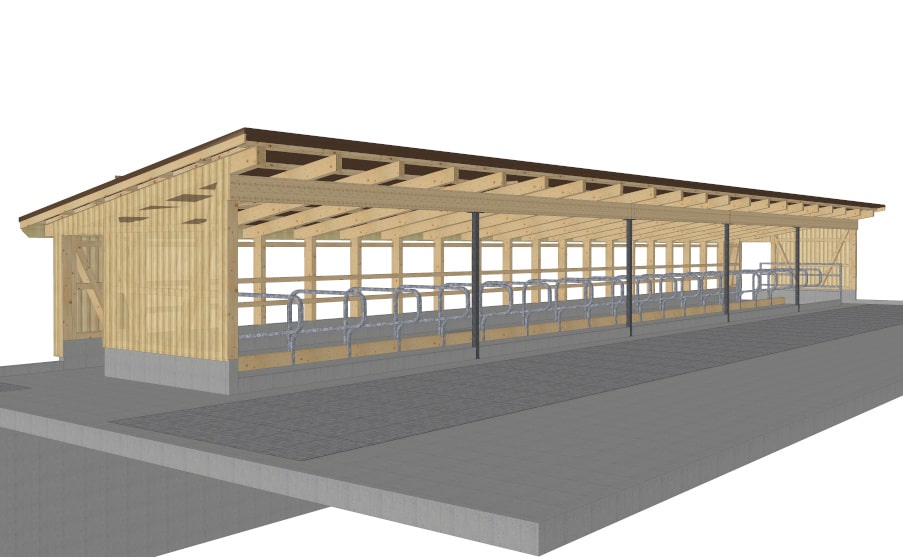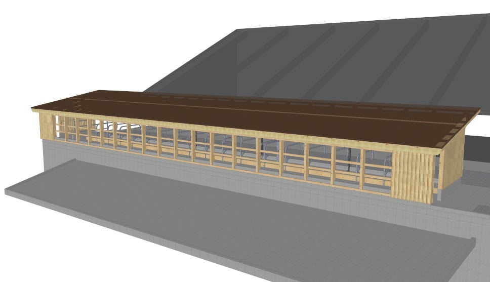 Projekt: Von der Projektierung bis zur Ausführung wird der Umbau und die Erweiterung für insgesamt 54 Milchkühe von uns geplant und mit Schweizer Holz gebaut. Der Laufhof mit perforierten Betonspaltenböden befindet sich auf dem neuen Jauchetrog mit 700m3 Volumen. Im Bestand werden die Separation, Abkalbebox und Liegeboxen neu eingeteilt und erstellt, damit der Melkroboter integriert werden kann. Die Laufgänge werden neu durch einen Entmistungsroboter gereinigt.