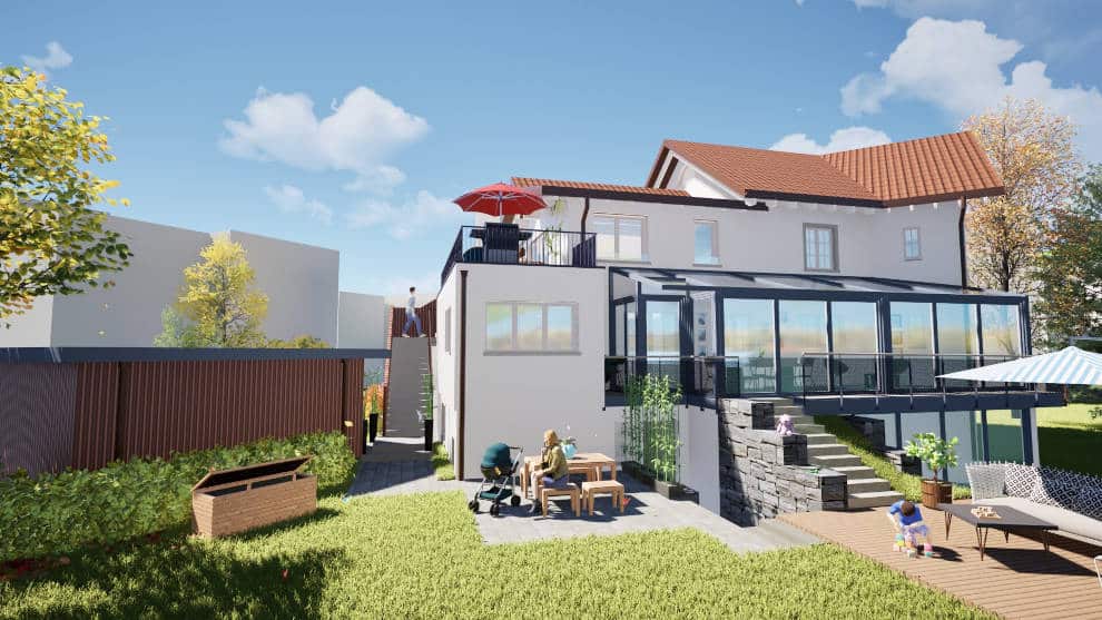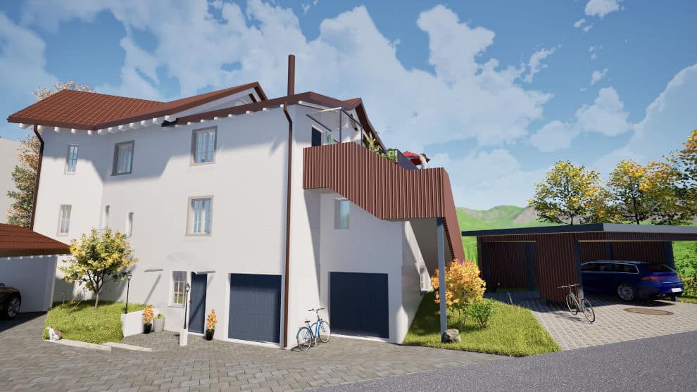 So auch hier bei diesem bestehenden Einfamilienhaus, welches mit einem Umbau zu einem Mehrfamilienhaus um konzeptioniert wird. Eine Aufstockung aus Holzelementen macht es möglich, dass mehr wertvoller Wohnraum entstehen kann, welcher nachher zeitgleich 3 Familien ein gemütliches Zuhause bieten wird.
