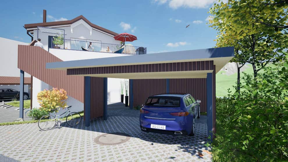 Ein zusätzlicher Carport soll die nötigen Parkplätze unterbringen und in derselben offenen Holzschalung verkleidet werden, wie die neue Zugangstreppe ins oberste Geschoss. So werden die Fassadenelemente raffiniert in Einklang gebracht und eine getrennte Zugangssituation wird ermöglicht.
